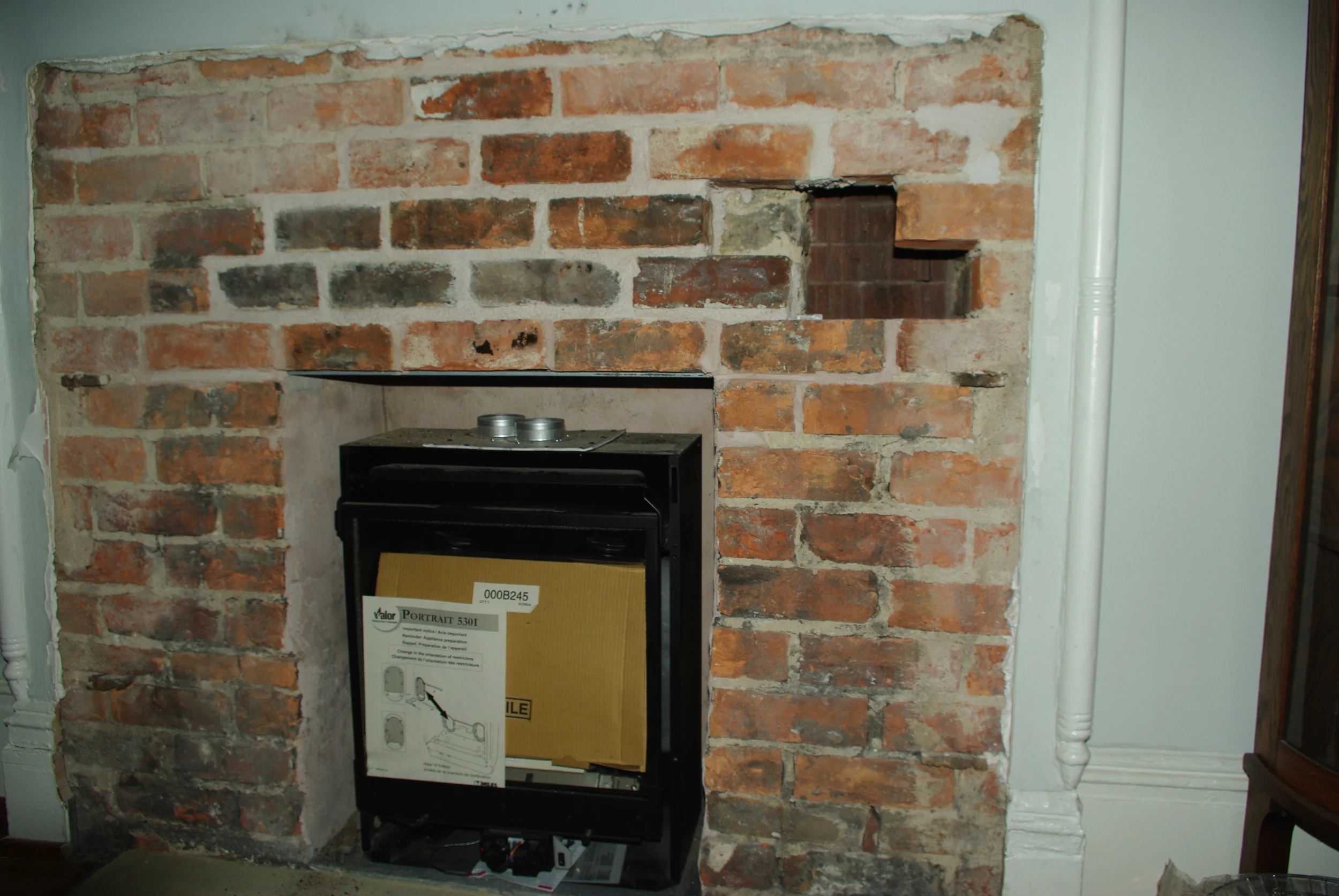 The gas stove/log, waiting for installation